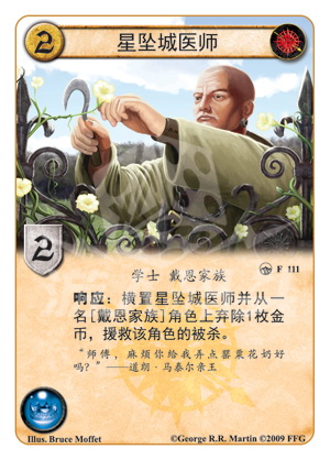 功能说明 响应:横置星坠城医师并从一名[戴恩家族]角色上弃除1枚金币,援救该角色的被杀。