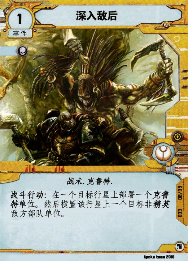 文本战斗行动:在一个目标行星上部署一个克鲁特单位。然后,横置该行星上一个目标非精英地方部队单位。