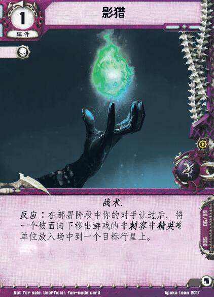 反应:在部署阶段中你的对手让过后,将一个被面向下移出游戏的非刺客非精英黑暗灵族单位放入场中到一个目标行星上。